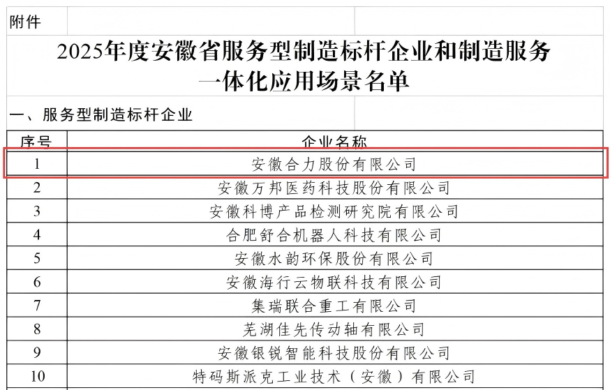 合力入選安徽省服務(wù)型制造標(biāo)桿企業(yè)