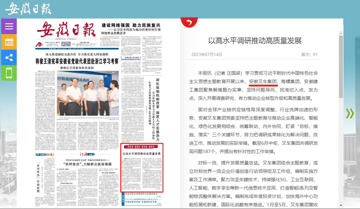 7月14日,《安徽日報》在頭版中就安徽叉車集團以高水平調(diào)研推動高質(zhì)量發(fā)展情況進行了報道。報道中表示,學(xué)習(xí)貫徹習(xí)近平新時代中國特色社會主義思想主題教育開展以來,安徽叉車集團聚焦解難題辦實事,堅持問題導(dǎo)向,找準(zhǔn)切入點、發(fā)力點,深入開展調(diào)查研究,有力...